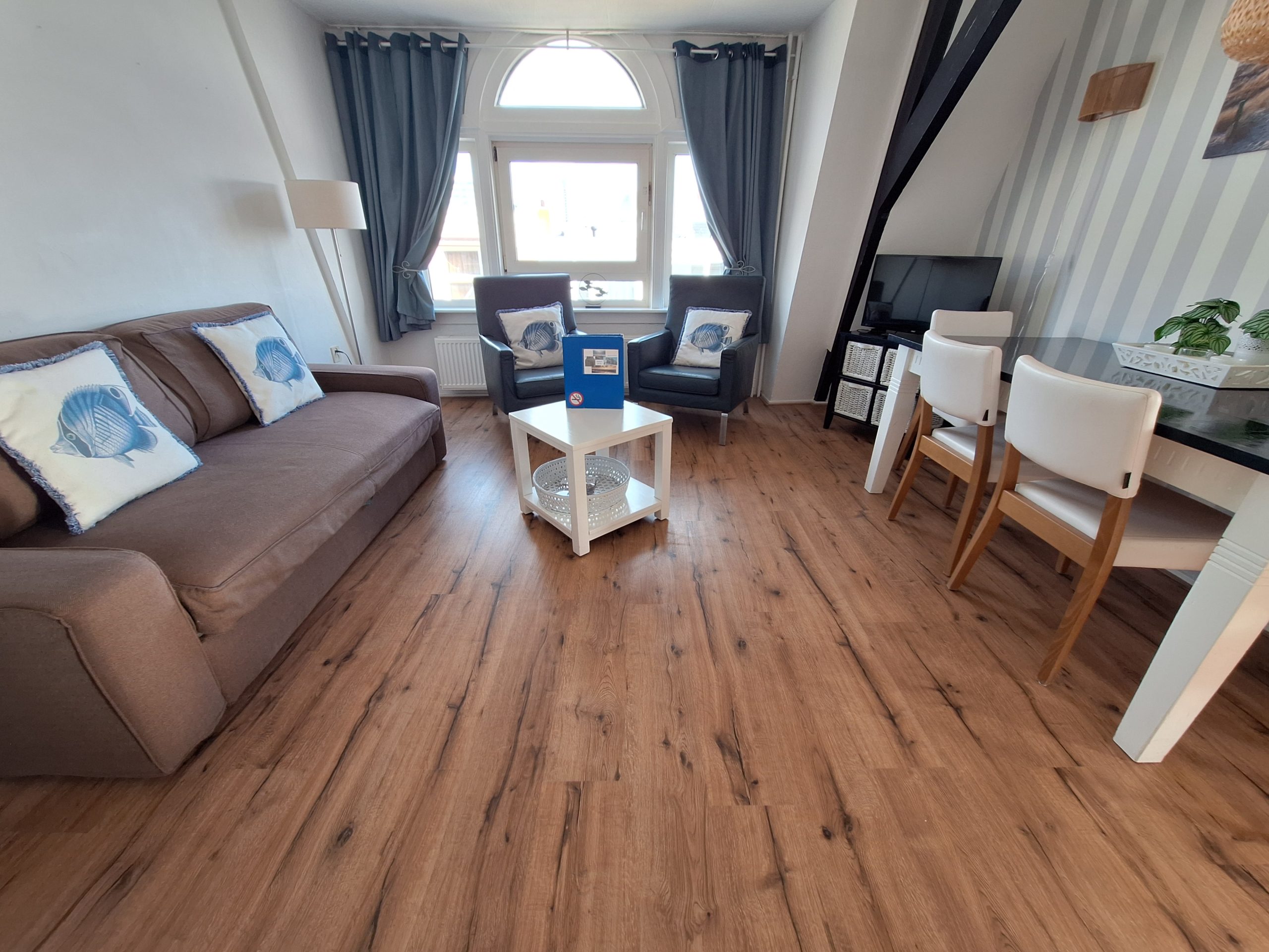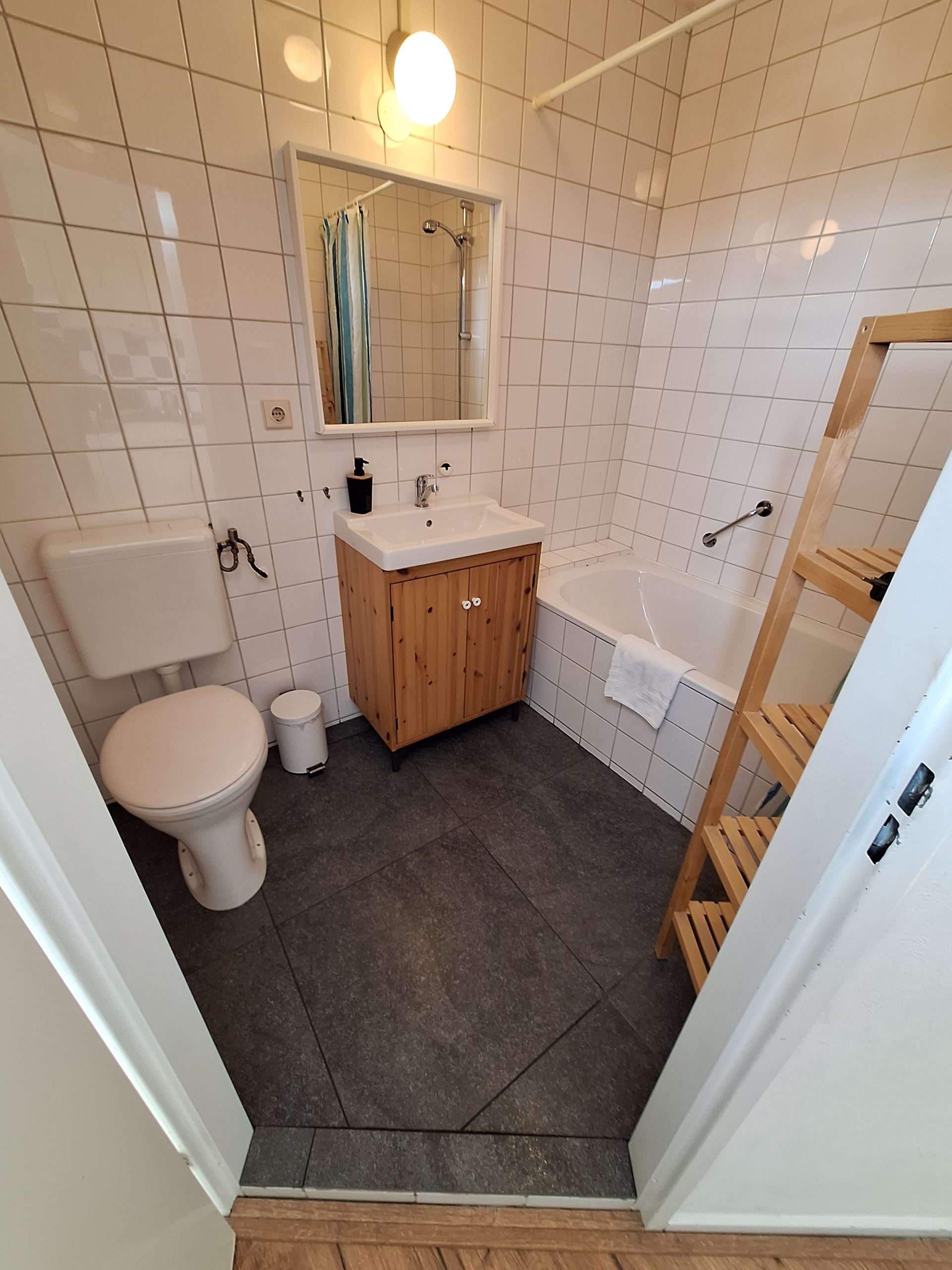 2en Stock (kein Aufzug!) – Schlafcouch (2 Personen) im Wohnzimmer – Schlafzimmer mit Doppelbett (160 x 200 cm) und Etagenbett (2 Betten à 90 x 200 cm) – Küche mit Herd, Kühlschrank, Wasserkocher, Toaster und Filterkaffeemaschine – Badezimmer mit Badewanne